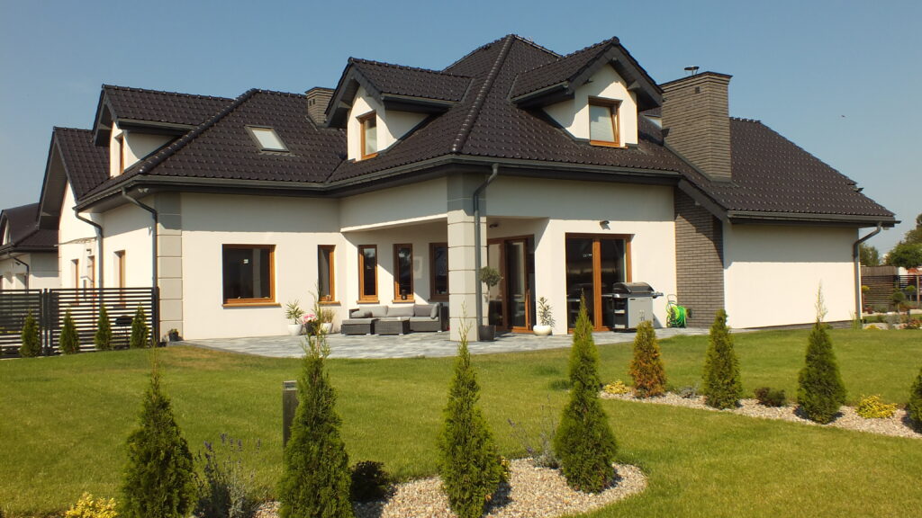 Dom jednorodzinny, stolarka aluminiowa YAWAL TM77HI+DP150, kolor strukturalny